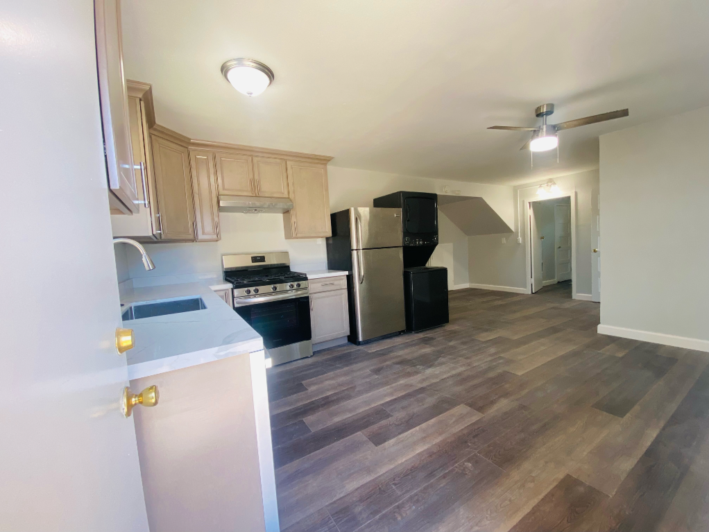 In-unit laundry: stackable washer and dryer conveniently located in the kitchen
