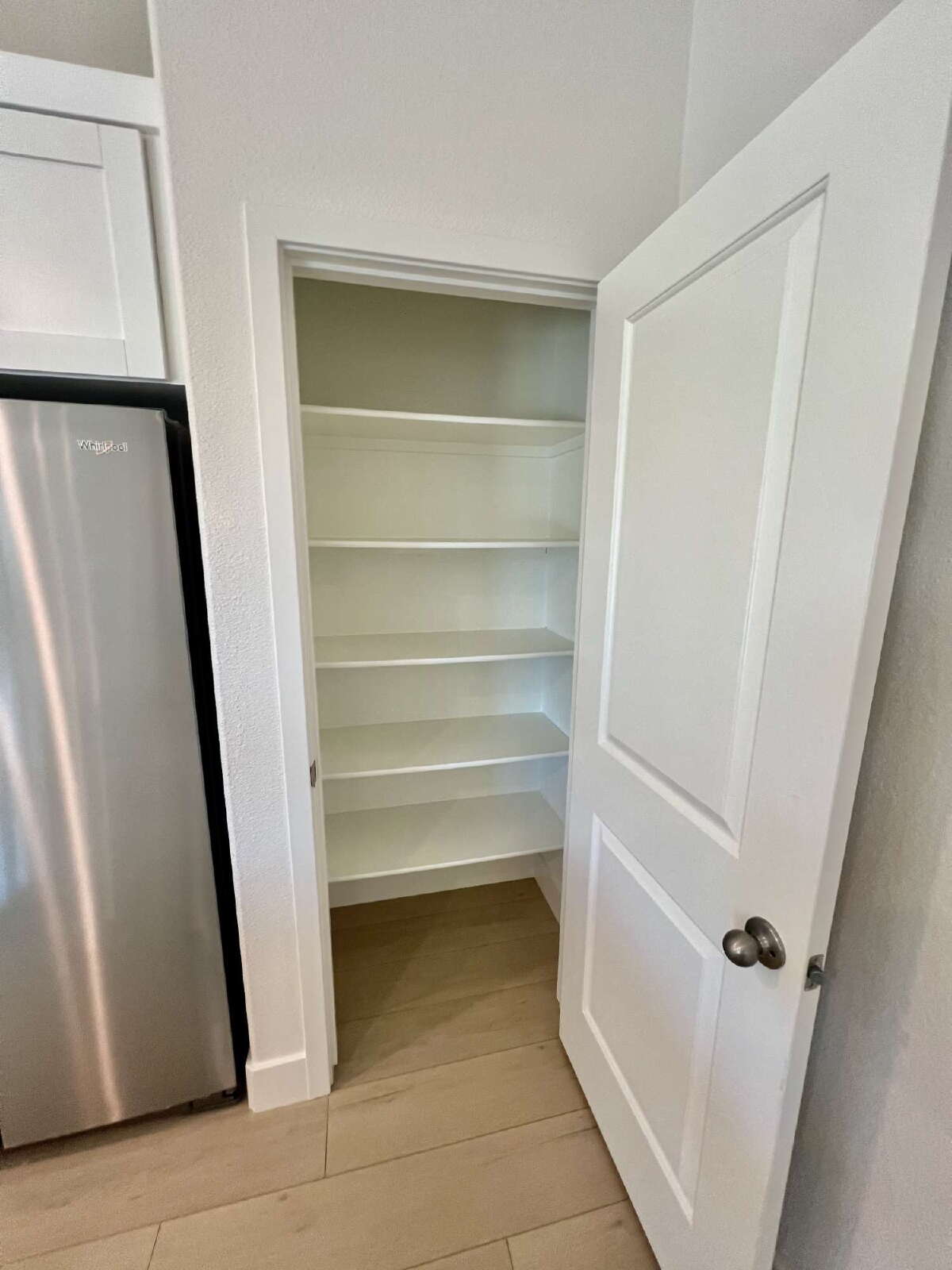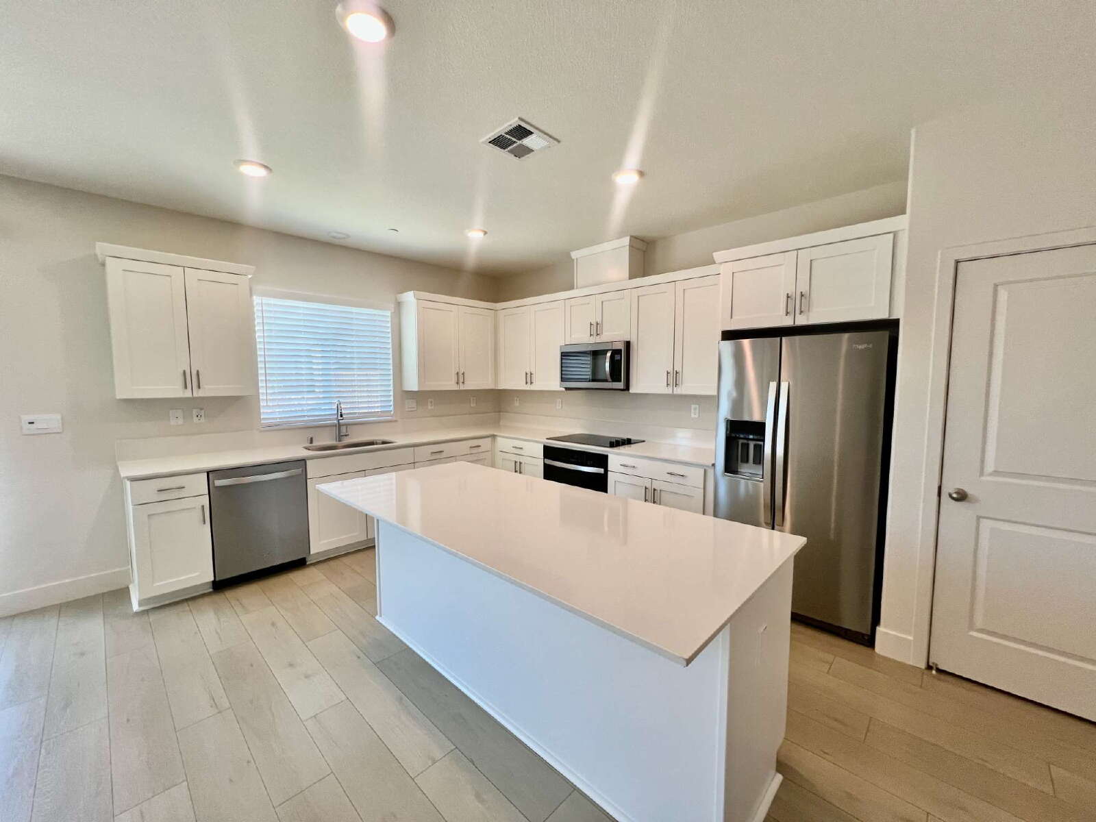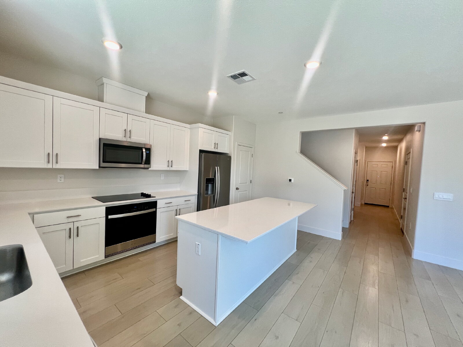 Modern kitchen with refrigerator, oven/range, and ample cabinet space
