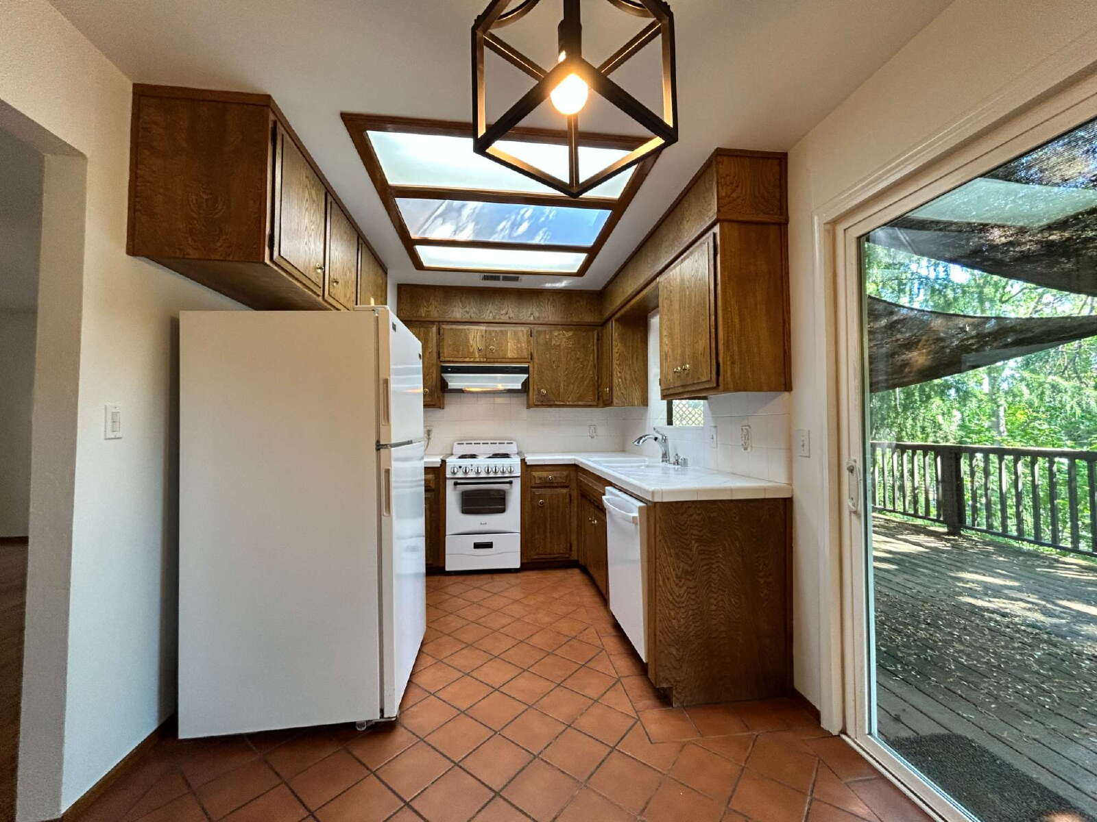 Enjoy relaxing or entertaining on the full deck patio, surrounded by lush garden views. Additional highlights include a decorative fireplace, fixed lighting, and window coverings provided for your comfort and ease.